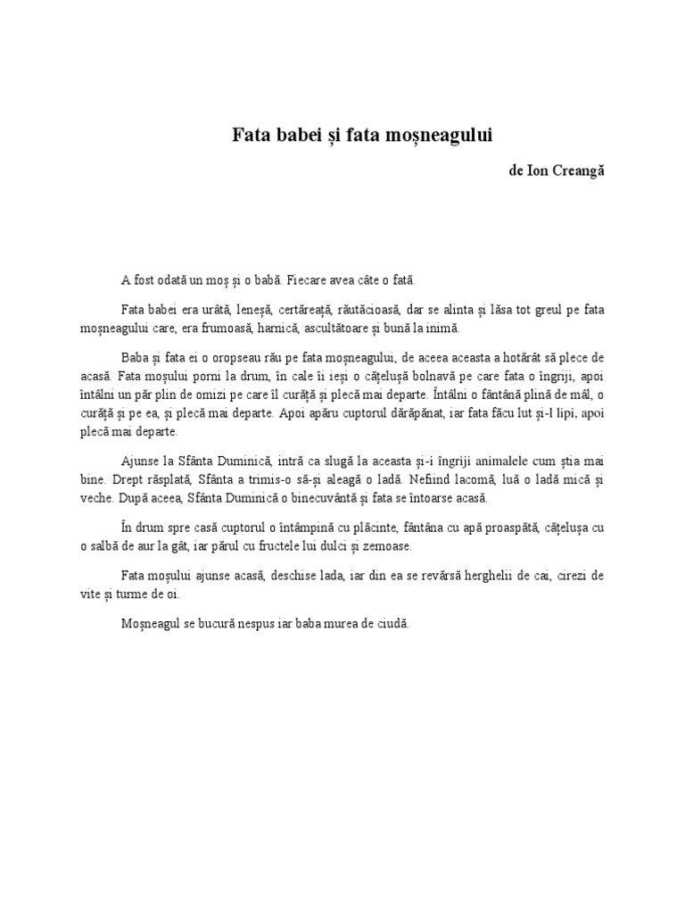 Povestiri Pe Scurt De Lecturi școlare Fata Babei și Fata Moșneagului